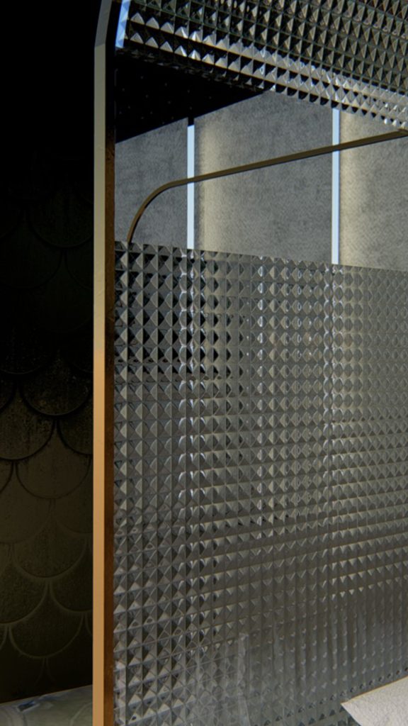 The inspiration for the bedroom space came from the book “The Old Man and the Sea” by Ernest Hemingway.The fascinating story of the character of the heroic old man who every day goes fishing with his boat in the sea and returns without results.The space around the bed was the sea for us and the bed (the boat) floated in these spaces.On the sides of the bed, several steps lead to the highest place in the room, the bathing area which is behind the bed.The water for bathing comes from many sprinklers located in the ceiling.The water then pours out in channels and creates small cascades on both sides of the bed.The back wall of the bathroom is completely covered with tiles simulating fish scales. (Hint to the big swordfish in the story) The special glass panel on which the bed is placed and which surrounds it in space, simulates a big wave in the sea,Inside it (in the part opposite the bed) is the TV screen, it can also be viewed from the bathing area.From the walls, delicate lighting emerges that creates reflections on the various surfaces – these simulate ripples in the sea…